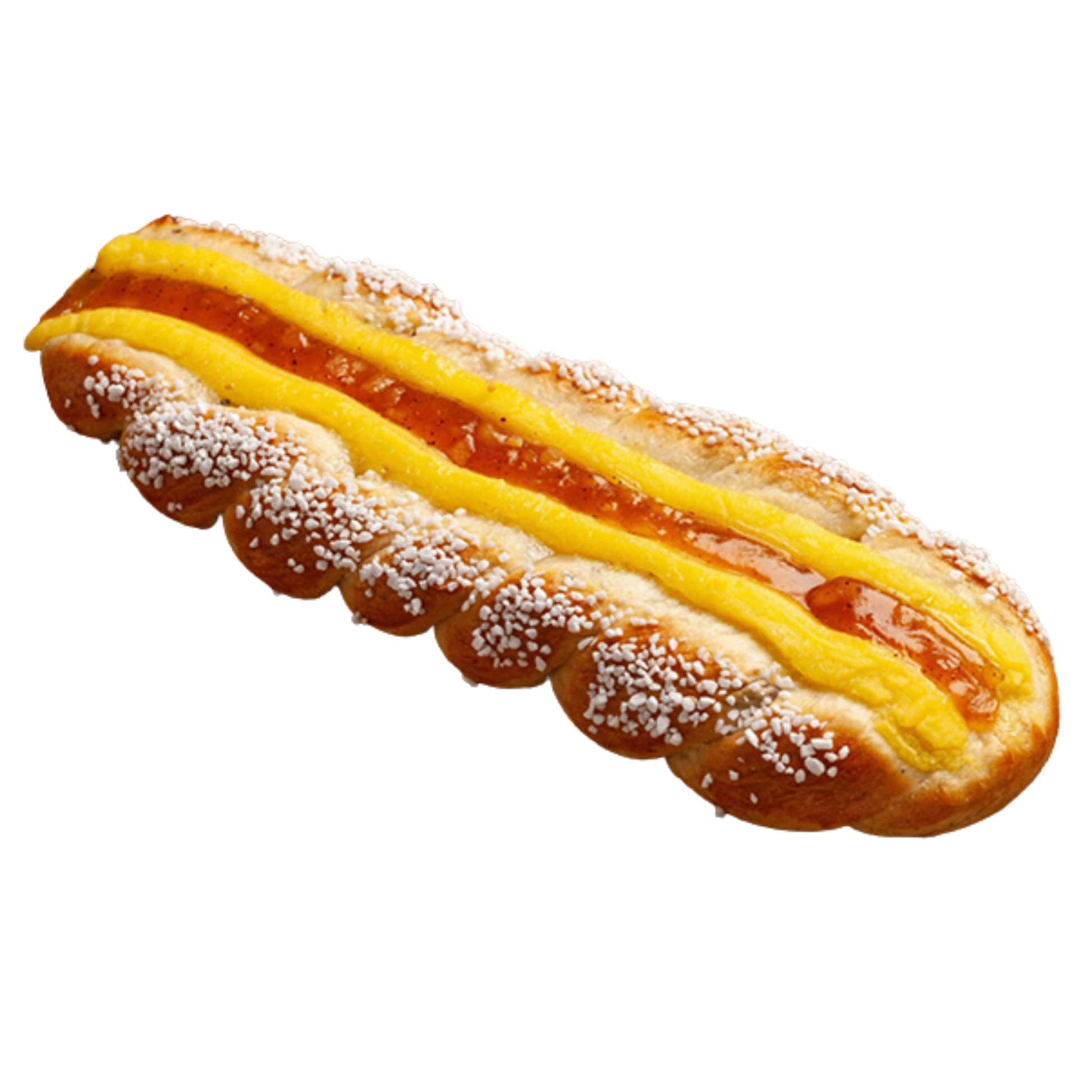 Herkullinen hillopitko vaniljakreemin kera. Saatavilla viisi erilaista hillovaihtoehtoa. Koristeena raesokeri. Sisältää rusinoita. Tuote on LAKTOOSITON.