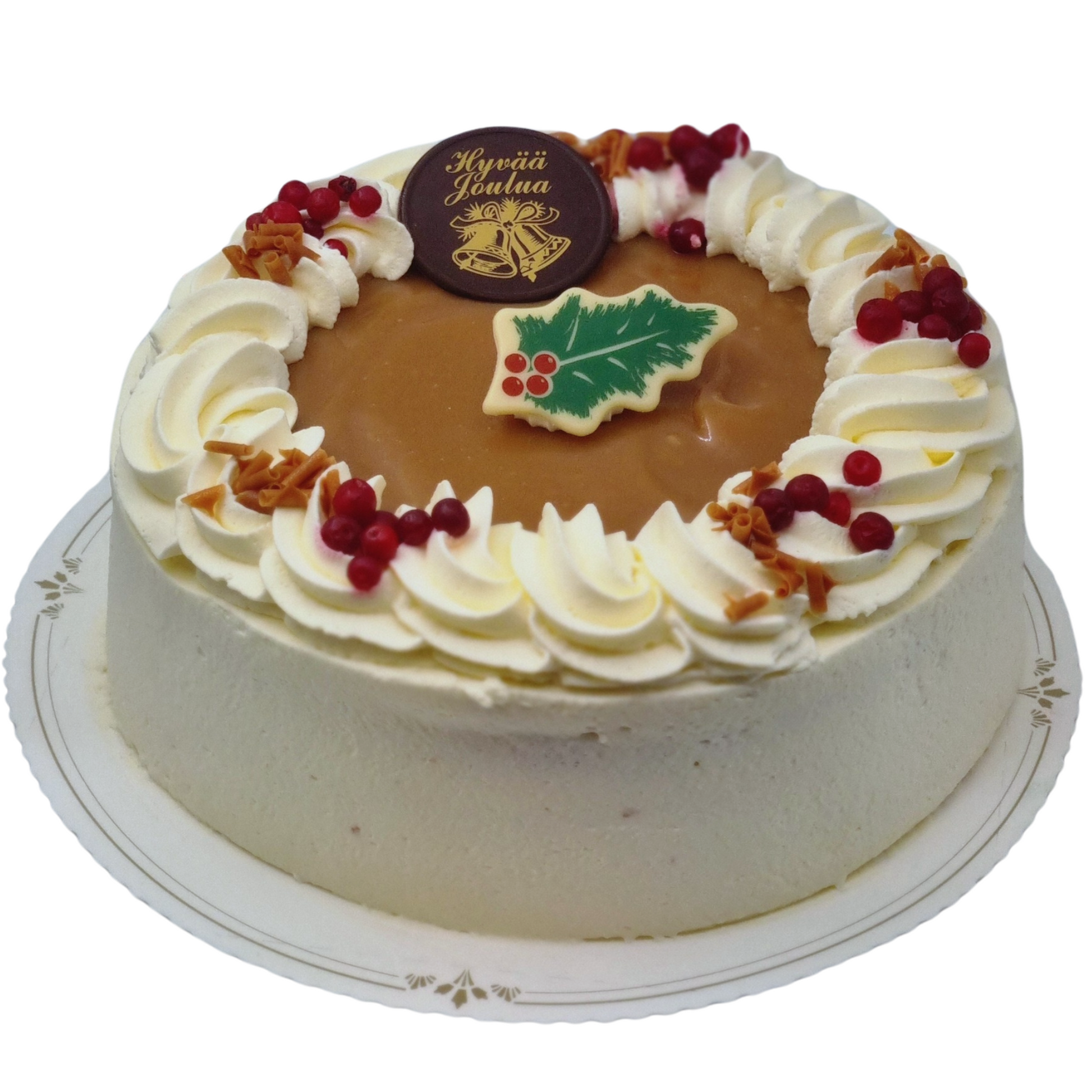 Vaaleaan kakkupohjaan leivottu kinuski-karpalo-puolukkakermakakku. Täytteenä karpalo-puolukkahillo ja vaniljakerma. Kakussa on kinuskikuorrutus. Koristeena jouluaiheiset suklaakoristeet. Kakun sileä reunus sisältää vispikermaa sekä kinuskikiharaa (sisältää laktoosia) tai riisikrokanttia.